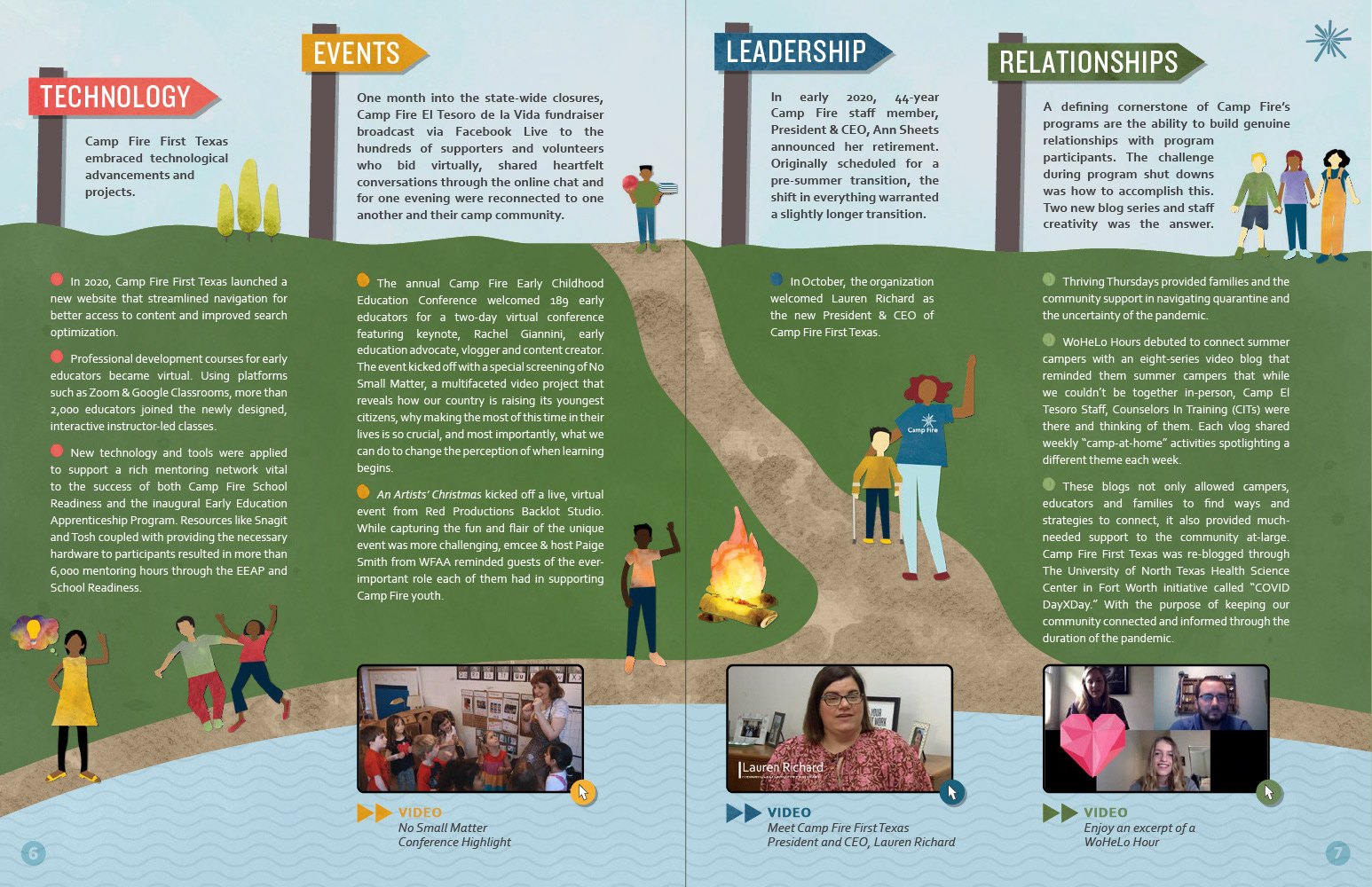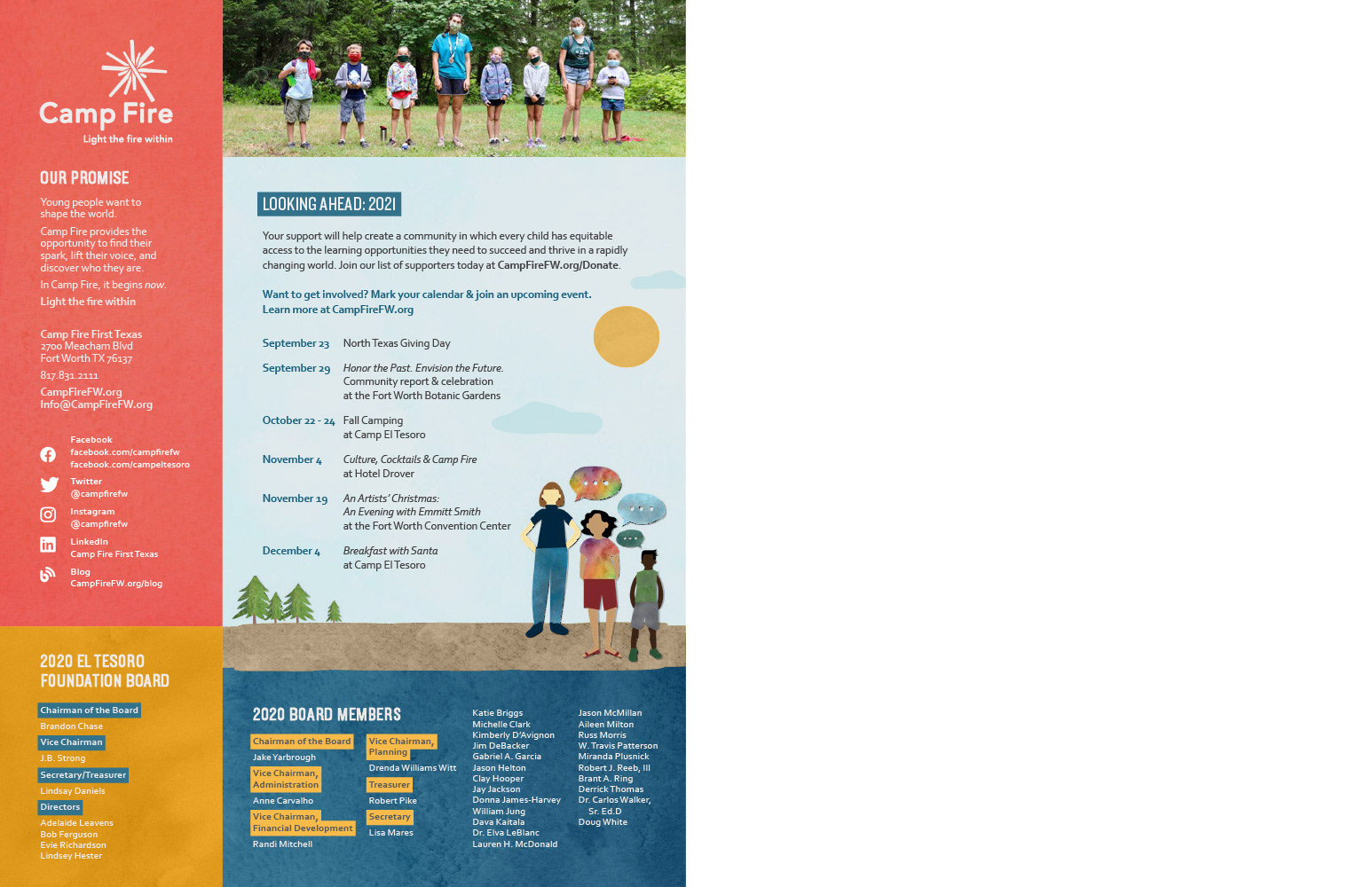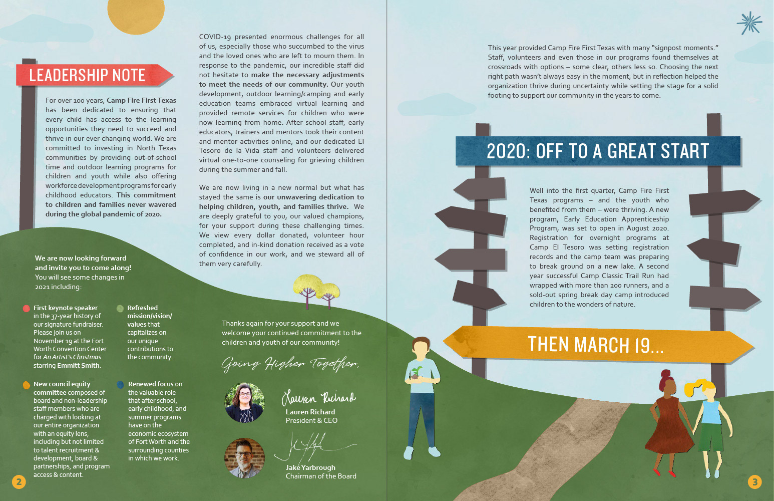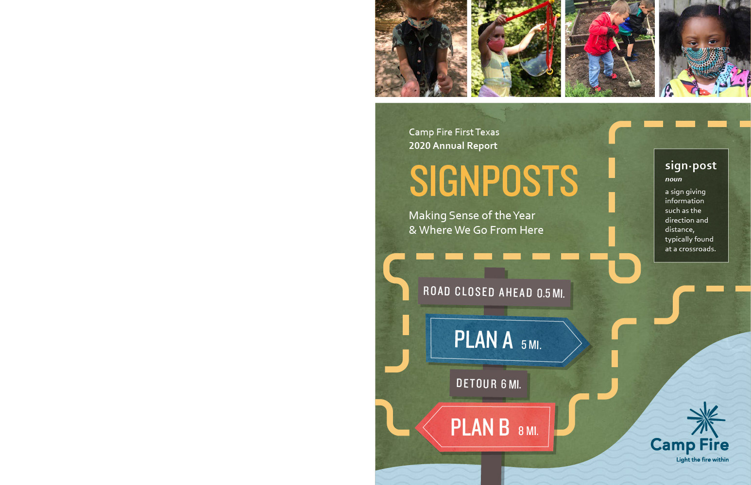 My 5th Annual Report for Camp Fire First Texas, a nonprofit in Fort Worth, Texas providing childcare, early child development, childcare teacher trainings, summer camps, afterschool programs, grief camps, and much more.