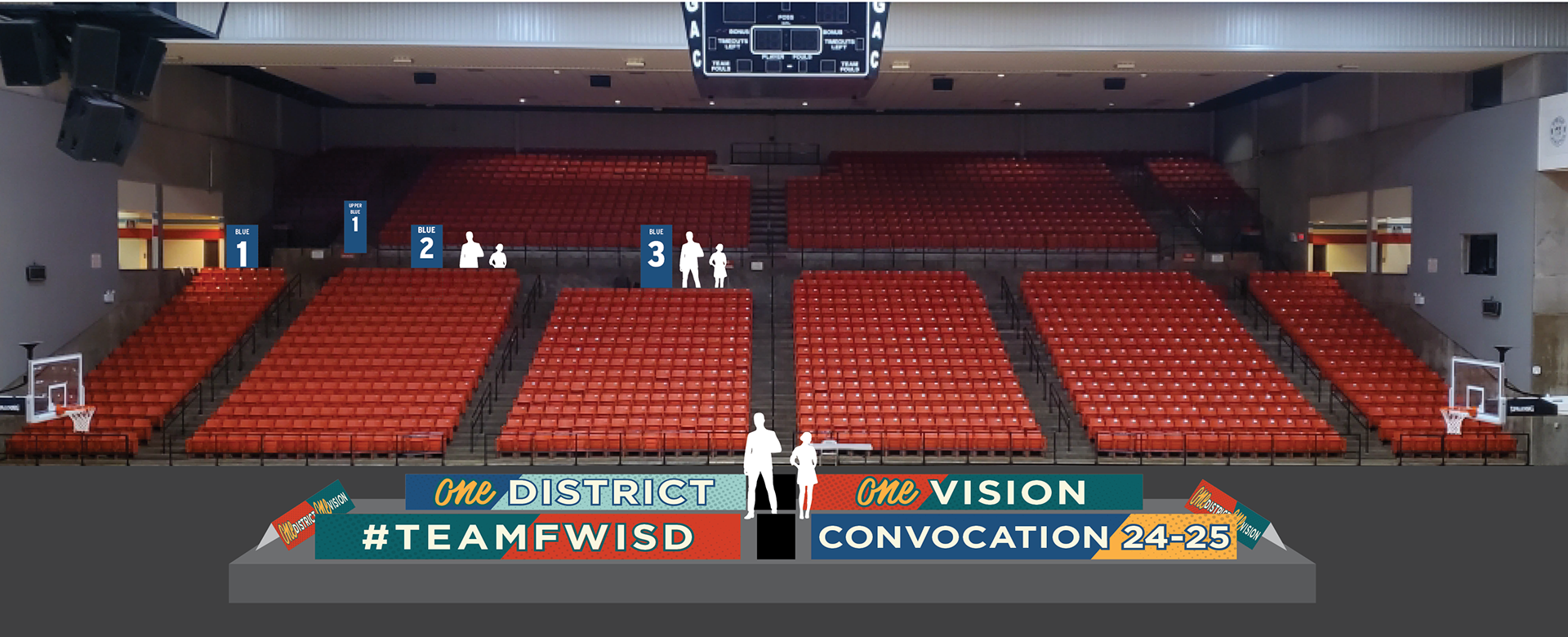 In between the two events, I guided volunteers to reset, using strategically hidden/stashed boxes of correctly ordered mascot signs to quickly mark out the next event's seats, going in a circle through the arena. I marked on my iPad map where each box was hidden so we wouldn't lose any. (I had them snuggled in the nooks and crannies behind the pipe and drape curtains.) We reset the whole stadium in about 15 minutes!