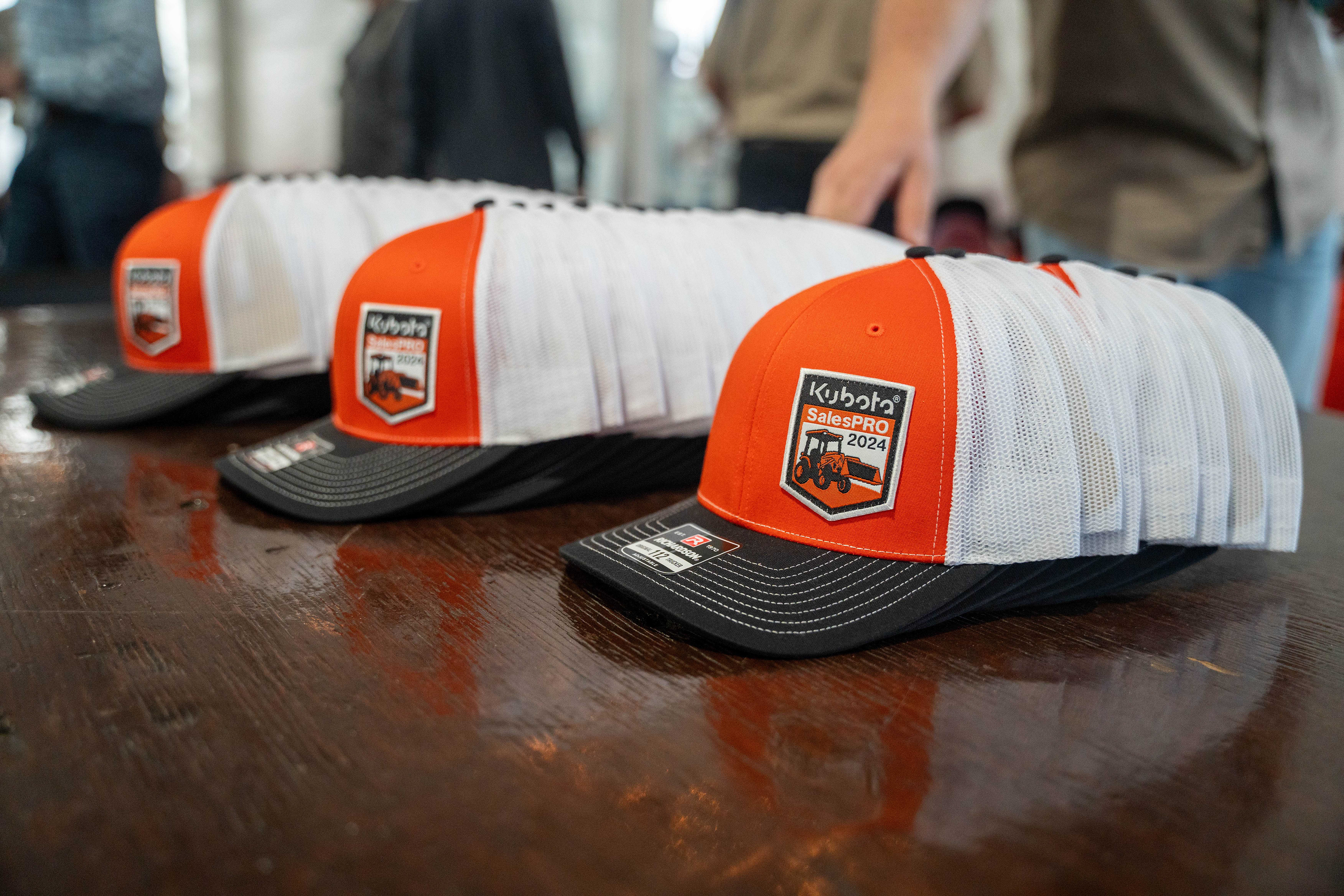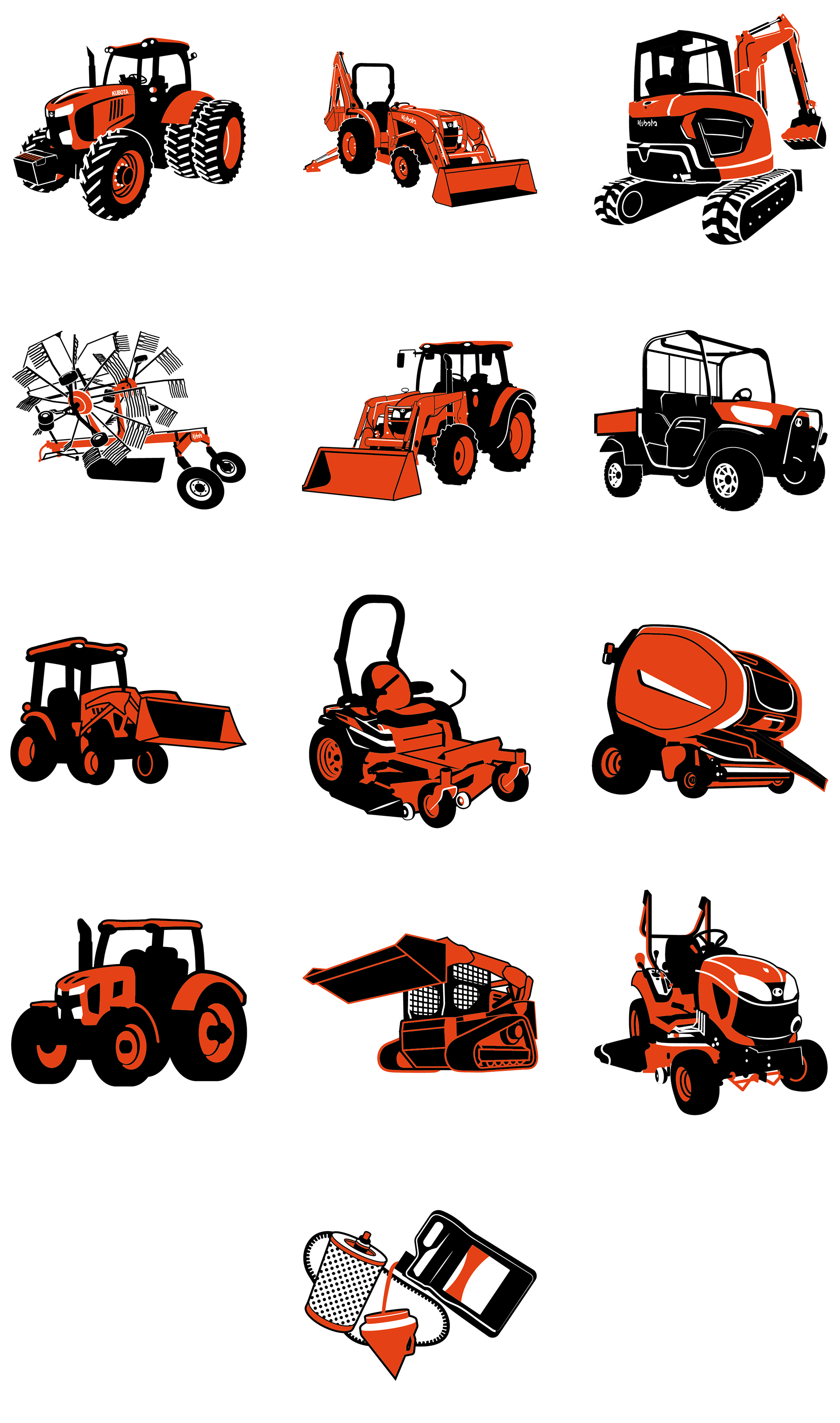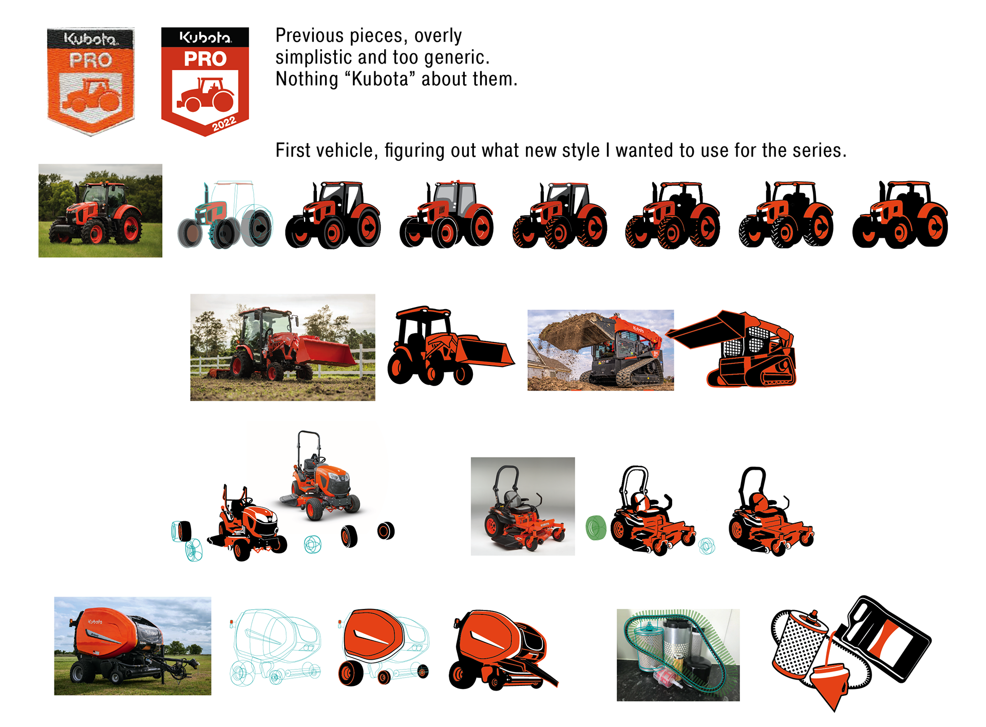 Custom illustrations placed into badges, earned by salespeople completing Kubota University sales training courses.